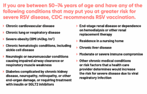 - For adults ages 50-74, a “risk-based” approach to vaccination is recommended. This means vaccination against RSV is recommended for those with certain conditions (such as chronic heart or lung disease, severe diabetes, or severe obesity, and those with a weakened immune system) and those living in long-term care facilities.