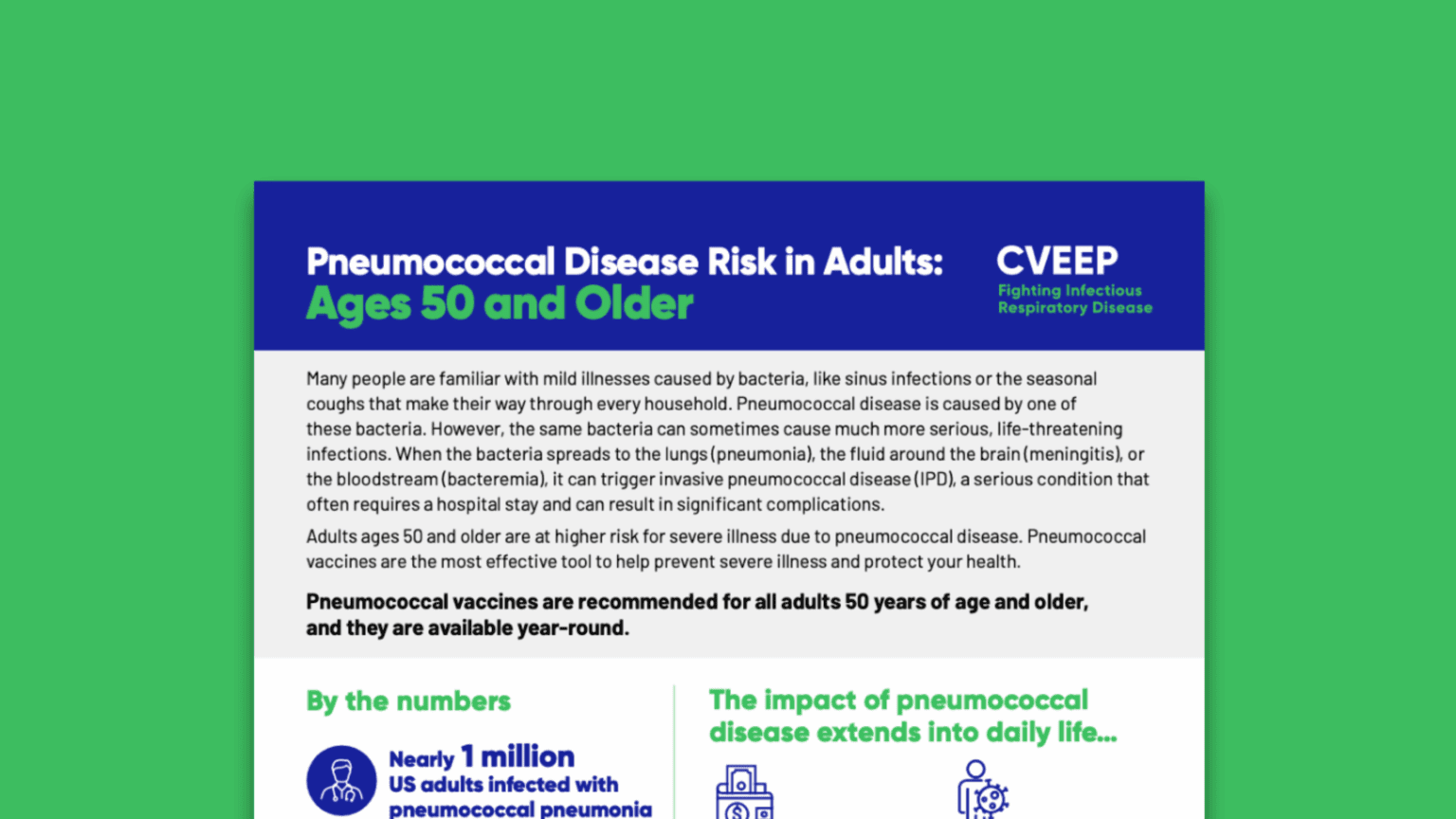 Most people think of respiratory syncytial virus (RSV) as a childhood illness, but the same virus can seriously affect adults, too. In fact, RSV rivals the flu in both the severity of illness and cost to older adults. Adults ages 75 and older are at the highest risk of severe RSV illness. Adults ages 50-74 can also be vulnerable, especially if they have chronic health conditions, such as asthma, diabetes, or heart disease. These factors can increase the likelihood of severe RSV illness or hospitalization.