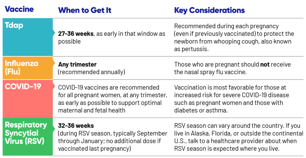 Women who are expecting can also be at higher risk of diseases like the flu and COVID-19. Vaccines that help protect against whooping cough (Tdap), flu, COVID-19, and RSV can help reduce the risk of becoming seriously ill or needing to be hospitalized during pregnancy.